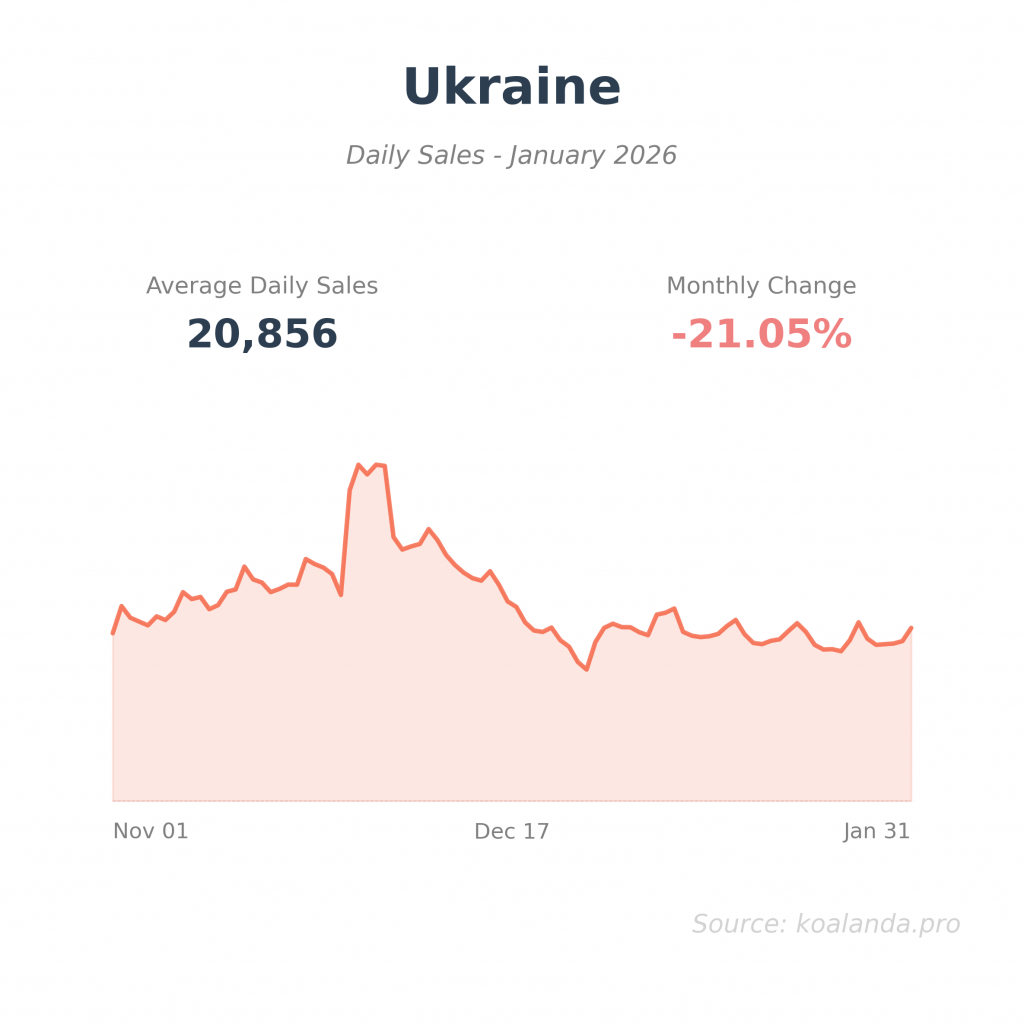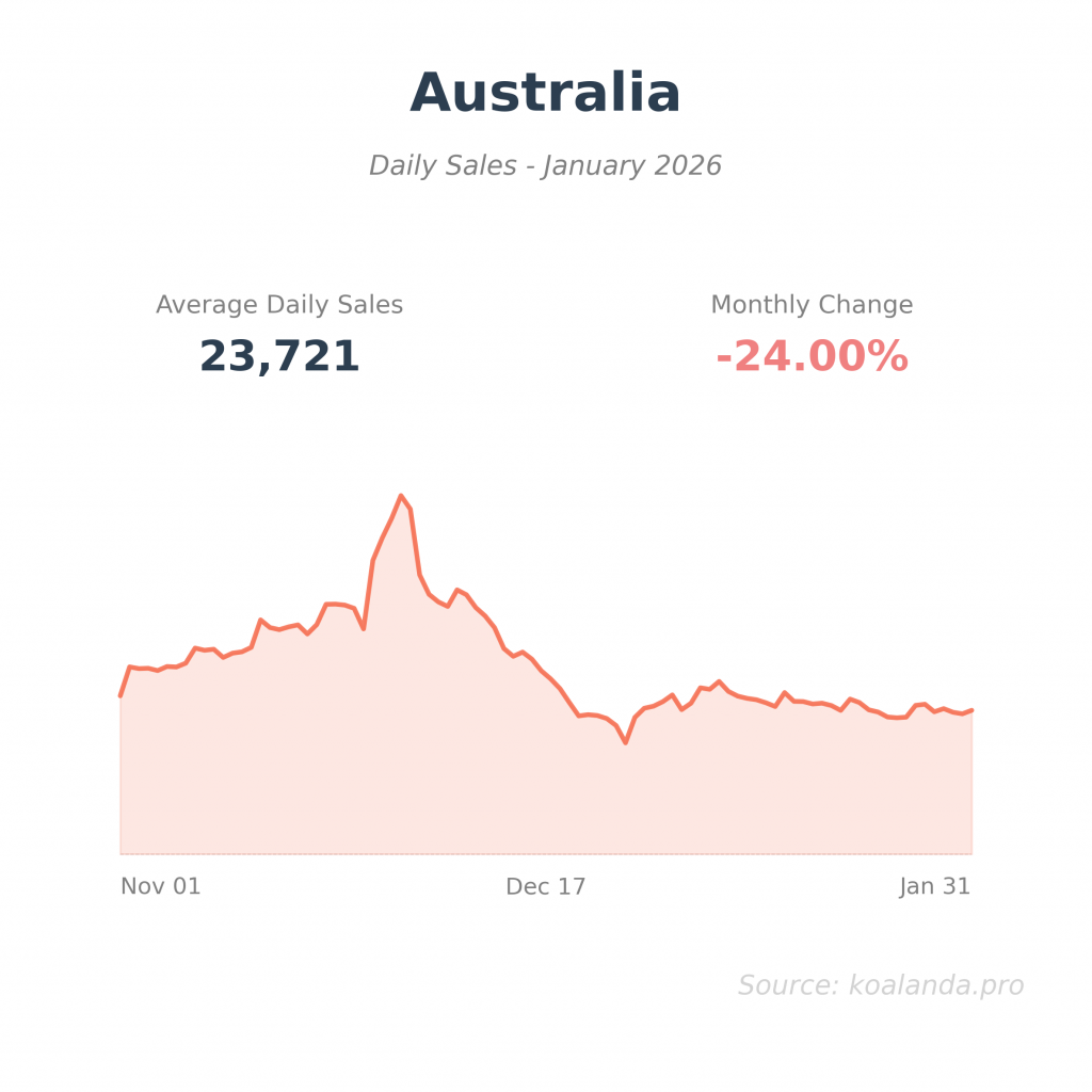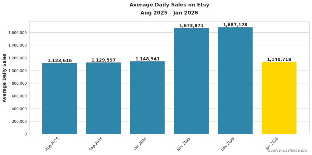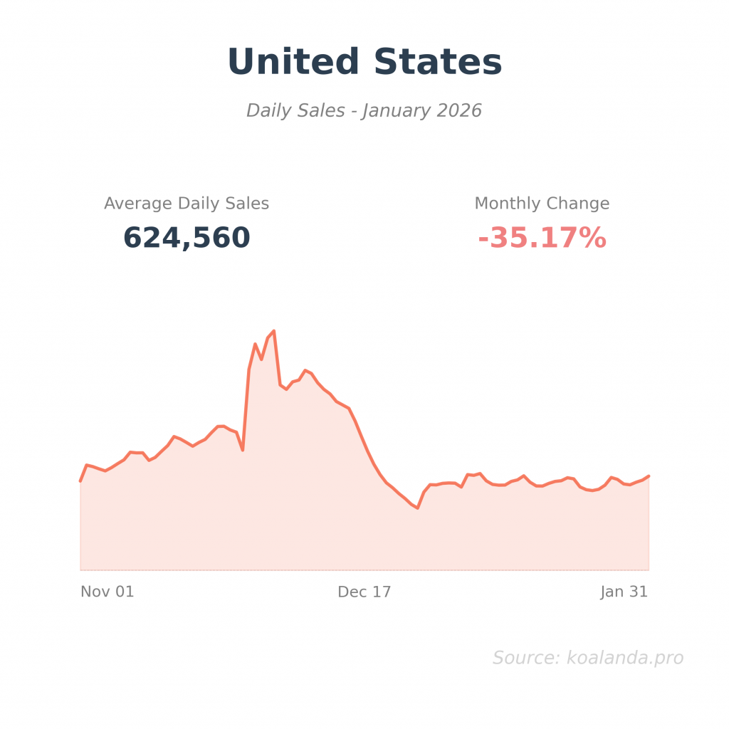 January’s average daily sales landed at 1,140,719, almost back to the pre-holiday baseline seen in late summer and early fall. After two elevated months—1,673,872 in November and 1,687,129 in December—January looks less like a stumble and more like a reversion to normal demand.