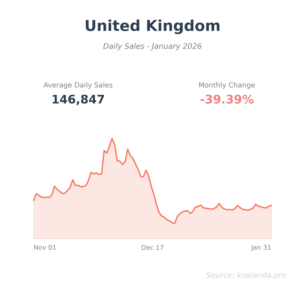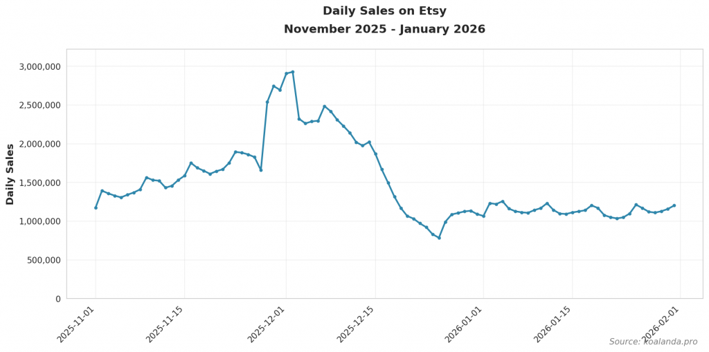 Daily sales data also shows how quickly the market cooled once shipping deadlines and gifting urgency passed. December started extremely high (over 2,900,000 sales on December 1–2) and then slid consistently toward late-month lows, while January stayed mostly in a tighter band around roughly 1,050,000–1,250,000 per day, with fewer dramatic spikes.