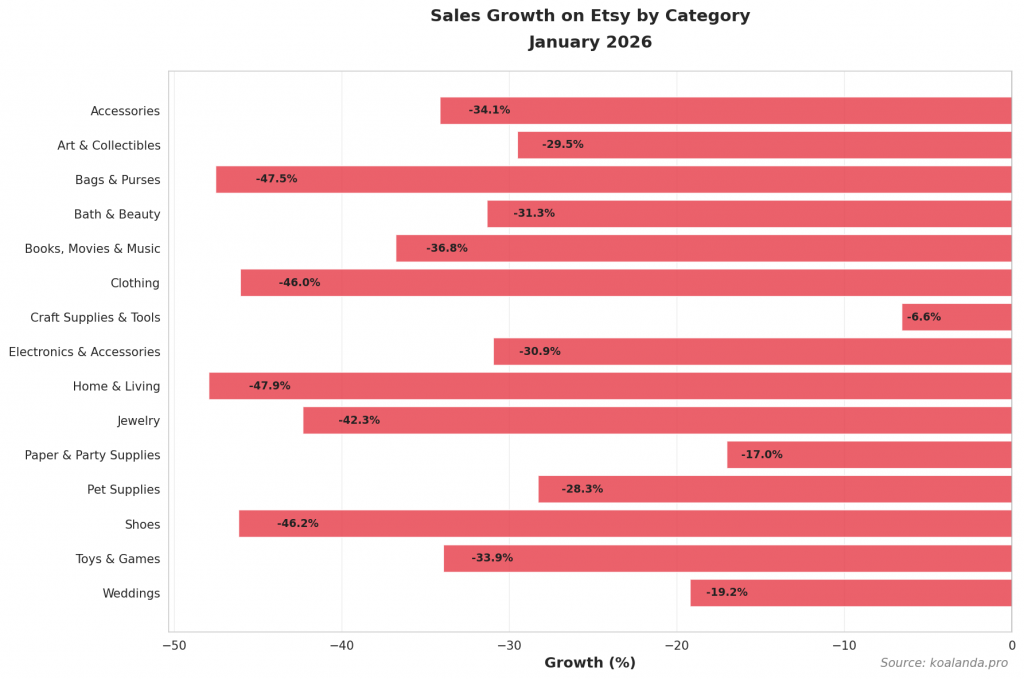 Every major category declined month over month, but the degree of decline is the signal worth reading. Craft Supplies & Tools had the smallest drop at -6.6%, while Home & Living fell -47.9%, and several fashion-adjacent categories dropped in the mid-40% range (for example, Clothing -46.0% and Bags & Purses -47.5%). This suggests buyers kept spending on “make-it” inputs more than “buy-it” finished goods right after the holidays.
