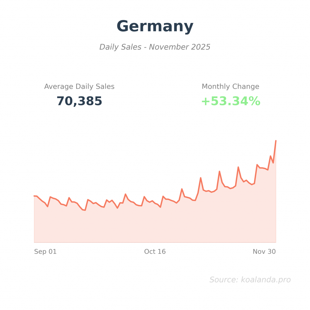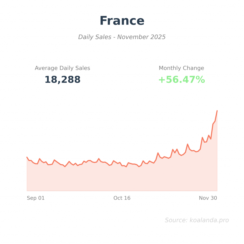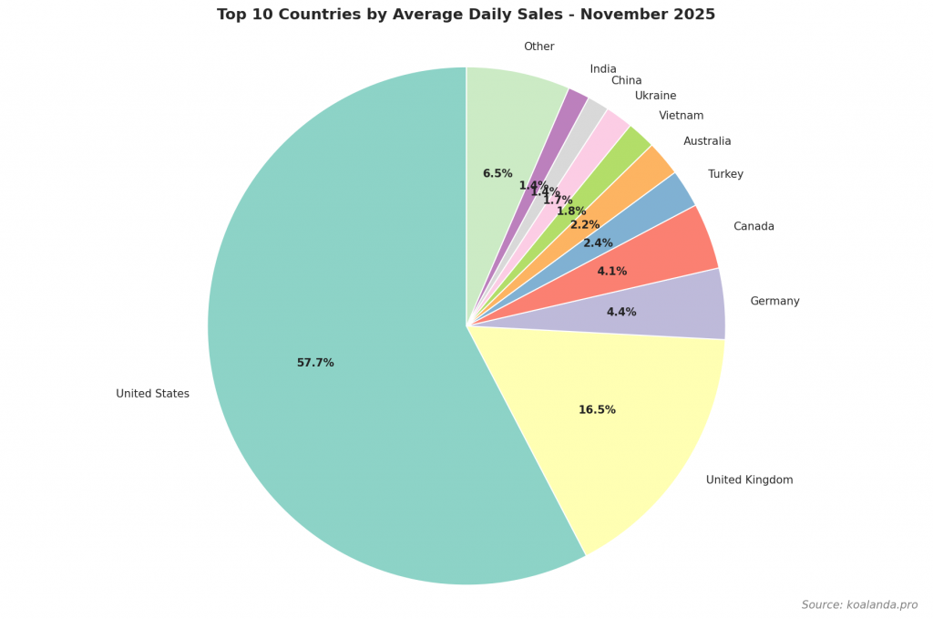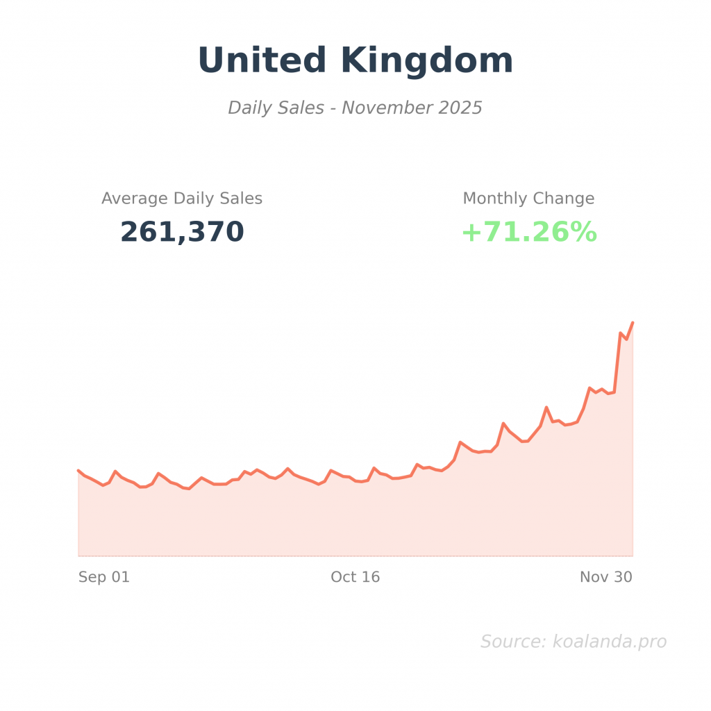 The United Kingdom stands out as the most dynamic major market. With 7,841,107 total sales and 261,370 average daily orders, UK sales grew by an impressive 71.3% compared to October. France also posted strong momentum with 56.5% growth, while Germany (53.3%), Canada (54.0%), and Australia (41.5%) all showed robust holiday acceleration. For European and Commonwealth-based sellers, this broad-based strength across multiple English-speaking and EU markets is a positive signal for cross-border expansion.