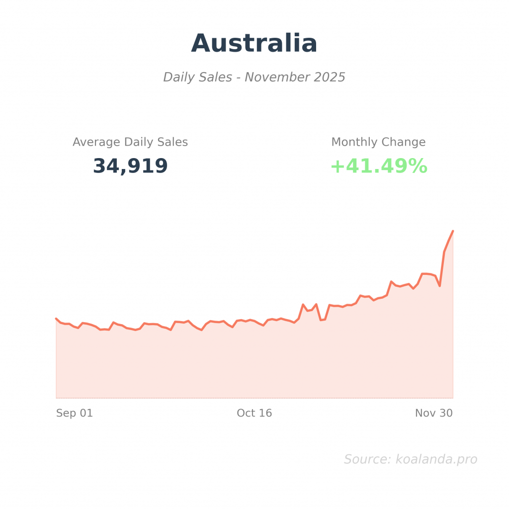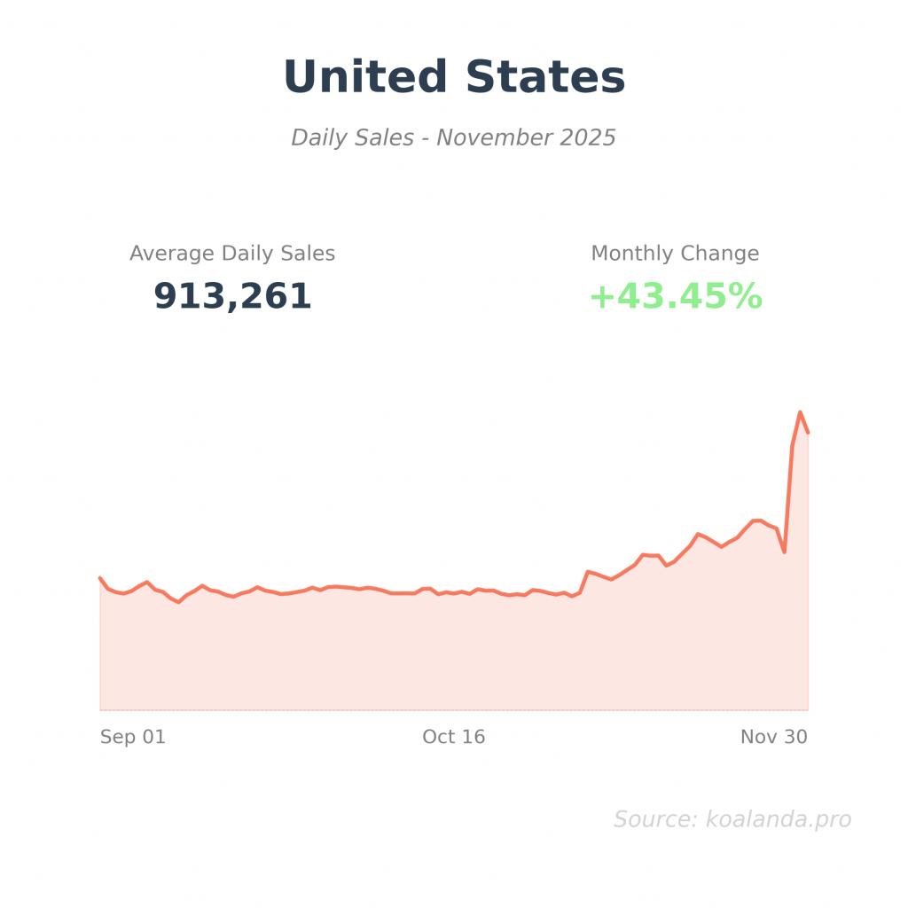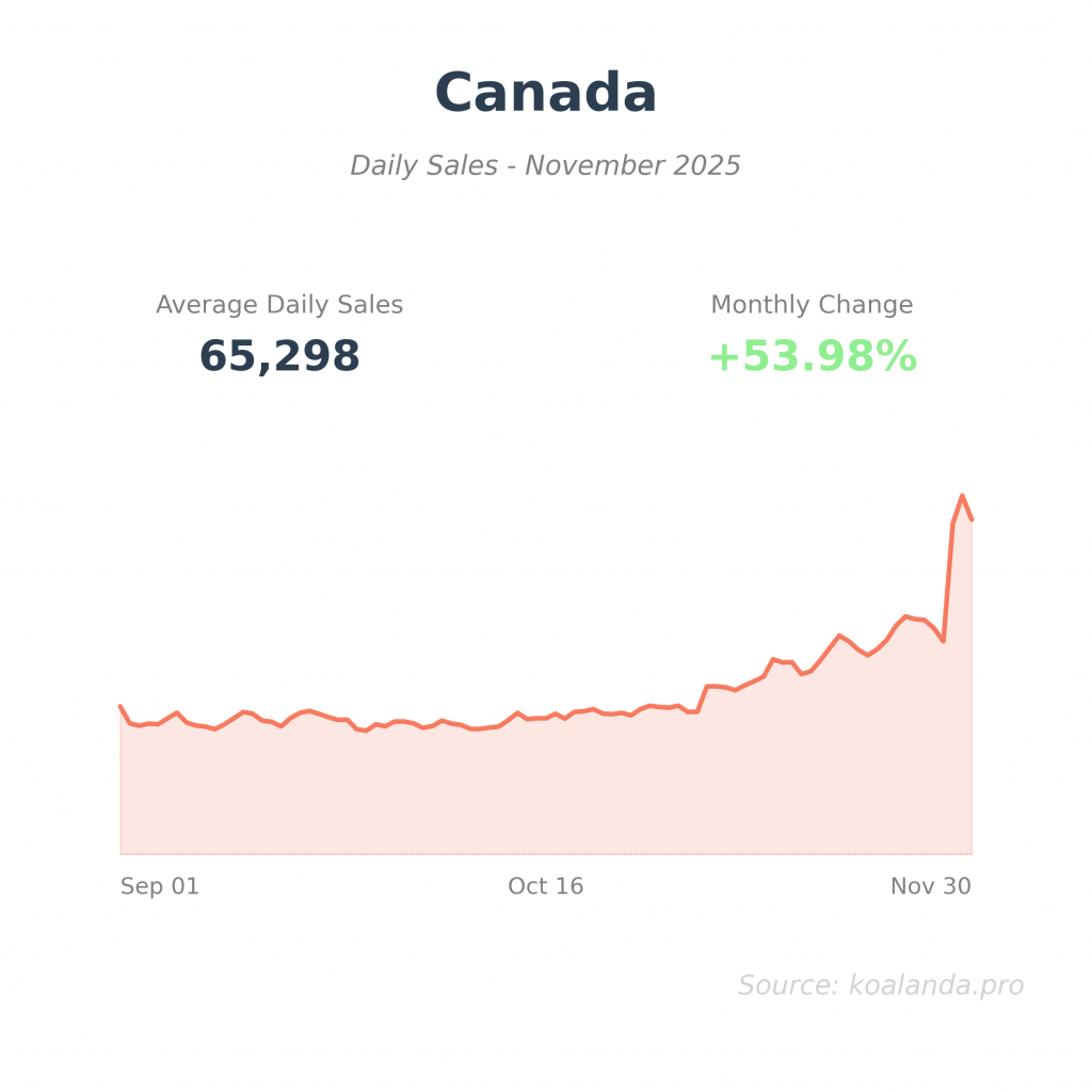 The United Kingdom stands out as the most dynamic major market. With 7,841,107 total sales and 261,370 average daily orders, UK sales grew by an impressive 71.3% compared to October. France also posted strong momentum with 56.5% growth, while Germany (53.3%), Canada (54.0%), and Australia (41.5%) all showed robust holiday acceleration. For European and Commonwealth-based sellers, this broad-based strength across multiple English-speaking and EU markets is a positive signal for cross-border expansion.
