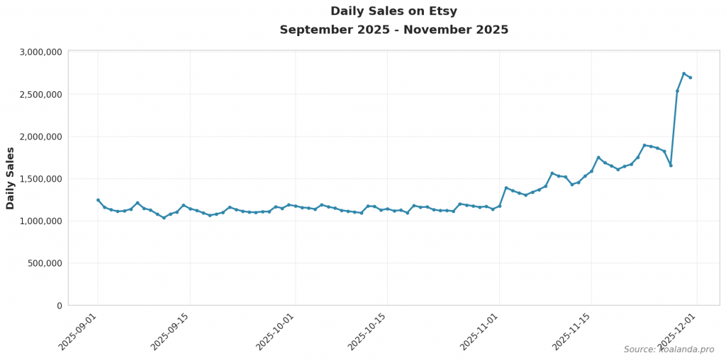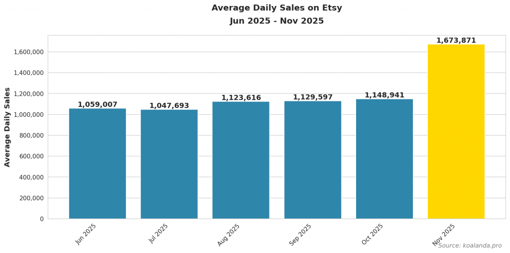 Etsy’s average daily sales rose from 1,148,942 in October to 1,673,872 in November, a very strong 45.7% month-over-month increase. This is one of the steepest jumps of the year and is clearly tied to holiday shopping, Black Friday, and early Christmas buying. For sellers, November is no longer just a “ramp up” month – it is already peak season.
