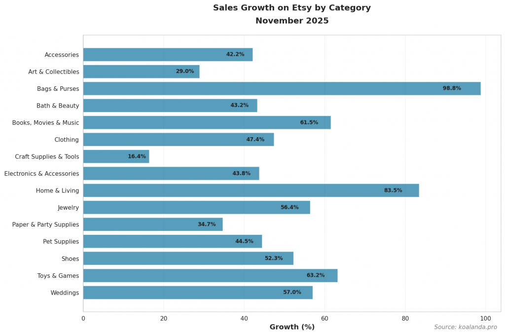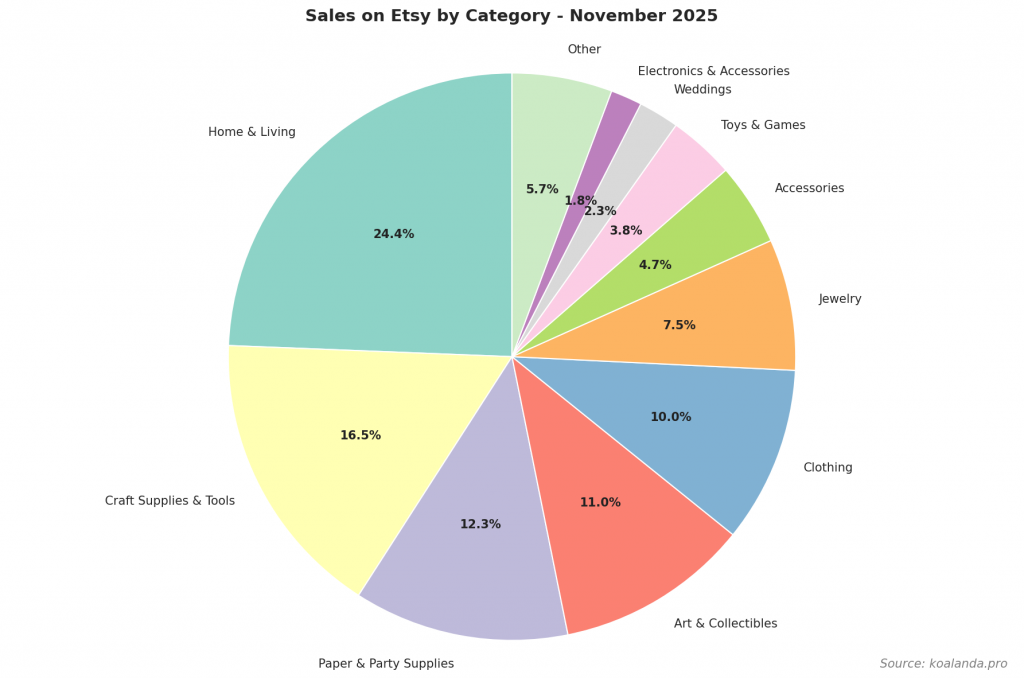 However, growth and volume are not the same story. Home & Living was both fast-growing and the top category by total sales, with 12,225,509 orders in November. Craft Supplies & Tools followed with 8,292,054 sales but only 16.4% growth, which suggests that supplies had already been purchased earlier in the year and in October for holiday production. Paper & Party Supplies (6,148,371 sales) and Art & Collectibles (5,539,613 sales) also occupied strong positions, confirming Etsy’s role as a platform for decor, stationery, and personalized gifts.